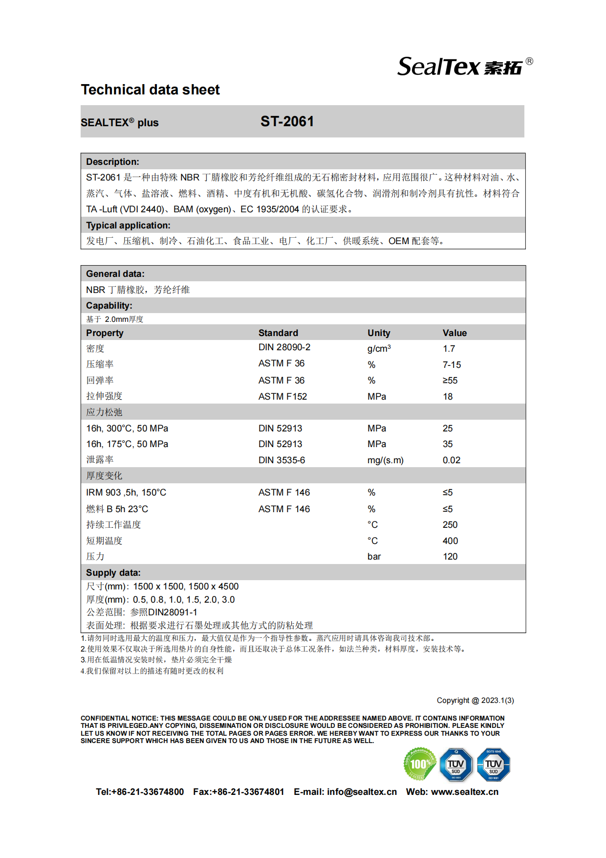 ST-2061 是一種由特殊 NBR 丁腈橡膠和芳綸纖維組成的無(wú)石棉密封材料,應用范圍很廣。這種材料對油、水、