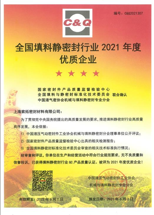 我司獲得全國填料靜密封行業(yè)2021年度優(yōu)質(zhì)企業(yè)稱(chēng)號