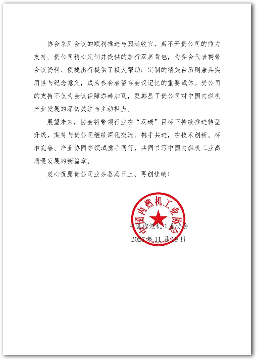 來(lái)自中國內燃機工業(yè)協(xié)會(huì )的感謝信